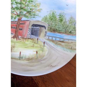 Hand-painted Red Covered Bridge Scene Decorative Plate Decor Trees Birds
