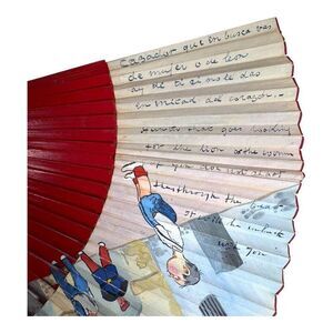 Hand painted Spanish Paper Folding Fan Red Wood Handle Handwritten Poem 17" READ