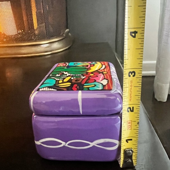 This product is a beautifully hand-painted terra cotta clay pottery trinket storage container, made in Mexico. The intricate designs and vibrant colors reflect the rich cultural heritage of Mexico, making it a unique and charming piece for storing small treasures or jewelry. The craftsmanship and attention to detail showcase the artistry and skill of Mexican folk artisans.