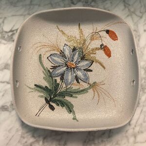 This dish is in excellent pre-owned condition. There are no chips or cracks. I do believe though, that the holes in the sides are for a rattan handle. I believe the dish at one time had handles. Regardless, handles or no, this is a beautiful piece. The design is really pretty and quite different from what is normally seen in Italian pottery. Also, the finish is textured. It is approximately 8 1/2” across.