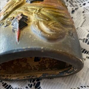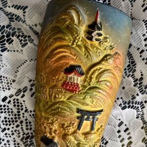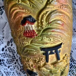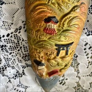 Interesting little piece measures almost 8 inches in height and 3 inches in width, is hollow on the interior and has an opening in the back to hang on the wall, stamped made in Japan on the top and has a scene of a village on it
