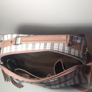 Taupe Macoly hands-free bag, made of synthetic (polyurethane), casual striped design with smooth texture. It has a large compartment, front pocket and back pocket, organizers, zip closure, handle and strap hands free.
