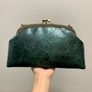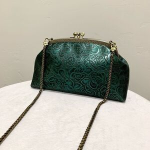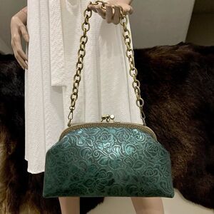 Vintage style. One of a kind. Chic and elegant design, large size clutch. Handsewn from premium embossed leather, unique double kiss-lock, twin compartment metal frame. This purse holds a lot, spacious enough for your phone, wallet, cosmetics, sunglasses, compact umbrella, keys, credit cards & other items. Includes 2 chains and a removable scarf, use in multiple ways, hand carry, wear as a shoulder bag or crossbody. The scarf can be removed from the chain, it is woven with the chain and can be used separately.