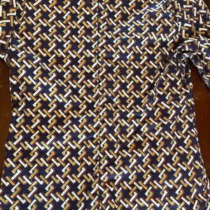 Colors pop in this design: navy background with gold, red, and white. Looks very fun yet expensive. Falls at your waist with a hidden zipper in the back. Contract fabric on cuffs and v neck. Size states Large but it fits like a Medium.