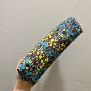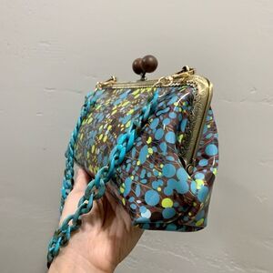 Handmade from genuine patent leather multicolor polka dot printed. Vintage style metal frame with natural wooden ball kiss lock closure. Includes 2 chain styles, use in multiple ways. Spacious enough inside for your phone, wallet, cosmetics, sunglasses, credit cards & other items.