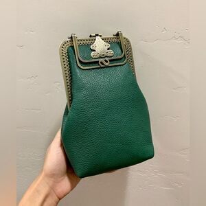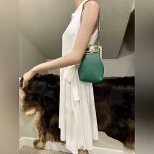 Brand new. Vintage Style. Chic design, great quality. Handmade genuine premium pebble leather with chic metal frame. Can be hand carried or with chains for crossbody. Can hold phone, small wallet, sunglasses, cosmetics, cards,
