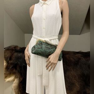 Brand new. Chic design, vintage style. This cute clutch is handmade from genuine premium full grain leather, with special push lock closure. Spacious enough inside for your phone, wallet, cosmetics, sunglasses, compact umbrella, credit cards & other items. With 2 style chains, use in multiple ways, hand carry, wear as a shoulder bag or crossbody.