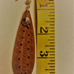 Hand-tooled Genuine Leather Earrings with Charoite pebble shaped gemstones in purple tones. The findings are gold plated. The painted accents are in purple to match the gemstone. Dare to be different or give something different!