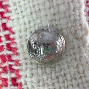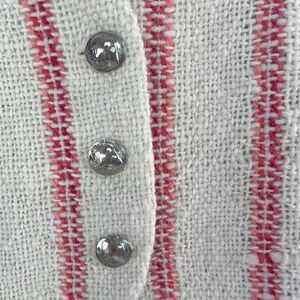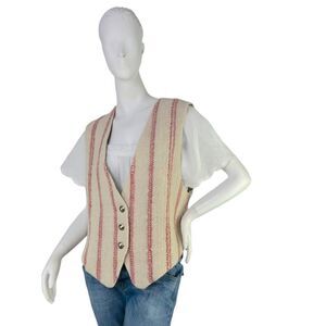 This is a handwoven alpaca wool vest woven by the Valle del Viento Weaving Studio in Ocate, New Mexico for the Victory Ranch of Mora, New Mexico. Women's size large. Excellent like new condition. This vest is off-white, pink and red, with a row of three buffalo nickel buttons. The back has a tie. Price is firm. All photos displayed are of the actual item. Measurements;