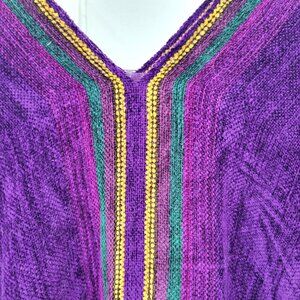 This expertly hand woven poncho presents a rich purple hue adorned with multicolor stripes, reflecting skilled craftsmanship. The fringe trim adds sophistication, making it a versatile addition to any wardrobe.
