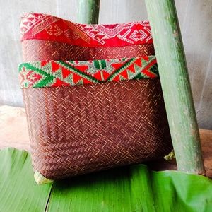 Custom handwoven purse made with with bamboo and silk embroidery by local village artisans. This bag features a traditional intricate supplementary weft woven design. It is custom made and can include a strap! Rattan and bamboo are both strong and durable materials, perfect for staple long-term use.