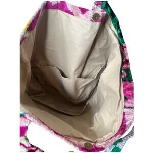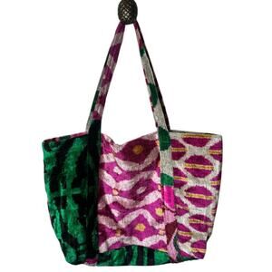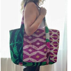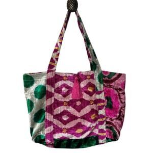 Handwoven Fuschia Green Silk Cotton Blend Tote Beach Bag W.Pom