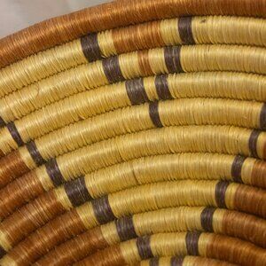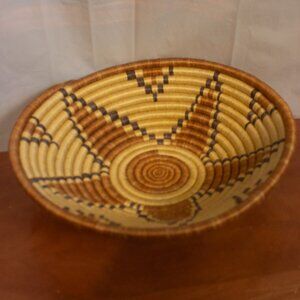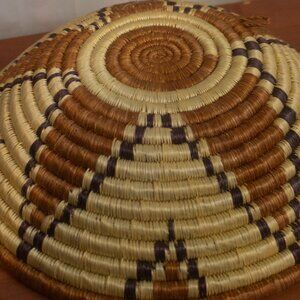 This handwoven geometric coiled basket is in good condition. The basket may have a West African origin although there are not labels or markings on the basket to verify this claim. This could be a good basket for bread serving or for decorating. The basket is about 12 inches wide and about 3 inches from tabletop. The color of the basket may vary from the images slightly because of lighting. There is also a loop of the back of the basket may make it good for wall decor. Please see images and ask any questions you may have.