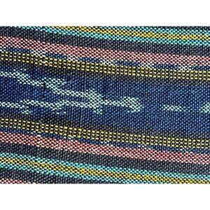 This handwoven Guatemalan ikat textile showcases intricate patterns and vibrant multicolor stripes. Its versatile design makes it suitable as a throw, shawl, or decorative piece.