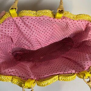• Color: Yellow exterior with pink and red heart accents; pink polka dot fabric lining