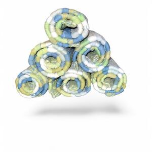Beautiful handwoven placemats with multicolor stripes. Features blue, green, and white tones. Perfect for adding a cozy touch to any room.