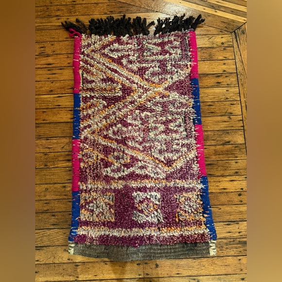 Moroccan handwoven multicolor wool rug with fringe. Featuring vibrant shades of pink, blue, and cream.