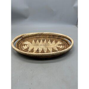 Handwoven Oval Basket Tray With Geometric Pattern handles brown READ
