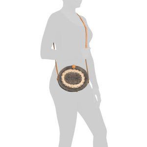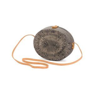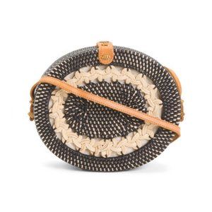 Handwoven Oval Wicker Rattan Crossbody Bag With Center Weave And Leather Trim