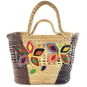 Handwoven Palm Leaf Tote Bag w/ Colorful Embroidered Butterflies Boho Beach