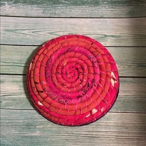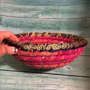 Vibrant handwoven basket in pink with gold accents. Perfect for decor or storage.