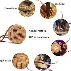 Elevate your summer style with this handcrafted round rattan bag — perfect for beach days, brunch dates, or festival fun. Size: 8 x 8 x 8 inches Color: Boho Rattan Lattice Condition: Brand new, no flaws. Features: Made from natural rattan and genuine leather straps, this lightweight and durable crossbody purse has a charming boho vibe. The spacious interior fits your phone, wallet, sunglasses, and keys securely with a snap closure. Lined with pretty patterned fabric for a fun touch. Material: Handwoven rattan, genuine leather Measurements: 8 x 8 x 8 inches Great for: Beach trips, summer vacations, casual outings, festivals, or brunch. It’s a versatile fashion statement that adds boho charm to any outfit. Ships quick from smoke-free, pet-free home. Reasonable offers welcome. Bundle to save!