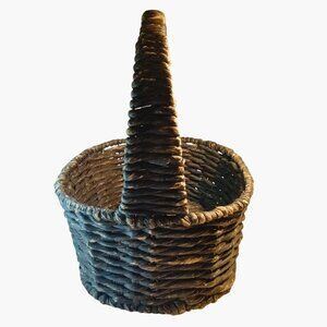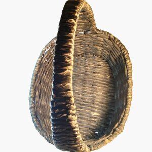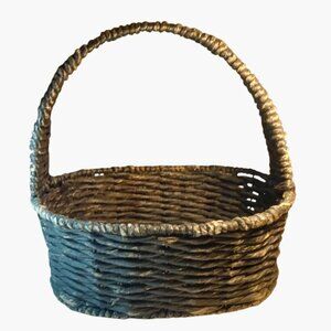 This handwoven basket features a sturdy handle and an oval shape, ideal for storing items or as a decorative piece in any room.
