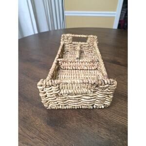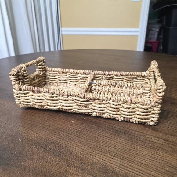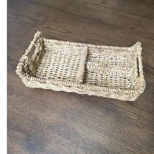 This is a handwoven wicker storage basket featuring two compartments and sturdy side handles. Perfect for organizing flatware, napkins, office supplies, cosmetics, or craft items. Its rustic, natural look makes it great for farmhouse, boho, or coastal décor.