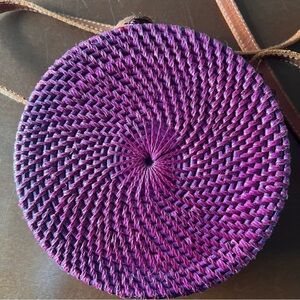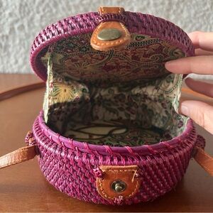 Handwoven Round Rattan Bali Crossbody Bag Boho Sustainable Button Closure Batik