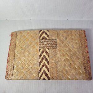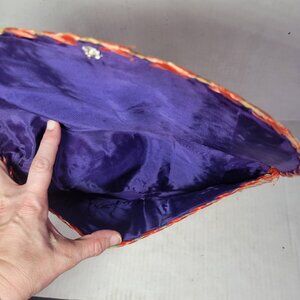 Handwoven Straw Clutch With Floral Raffia Embellishments & Purple Satin Interior