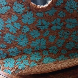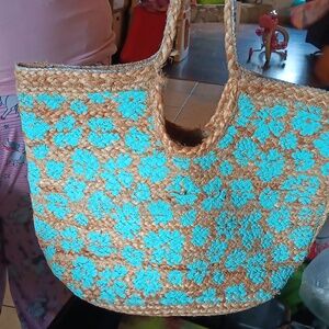 Stylish handwoven tote bag in tan and blue. Perfect for casual outings.