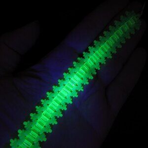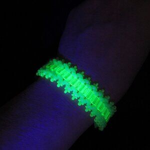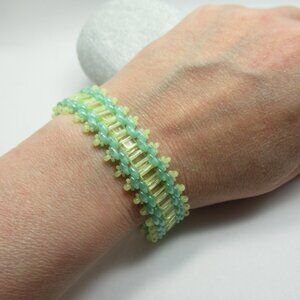 This listing is for the hand woven Czech Uranium glass two hole tile, superduo and seed beads bracelet pictured. It is new and has never been worn. It is 8 inches and finished with a silver plated, nickel free toggle clasp. This bracelet was handwoven by me. The beads in this bracelet glow brightly under blacklight due to the Uranium used in making and coloring the glass.