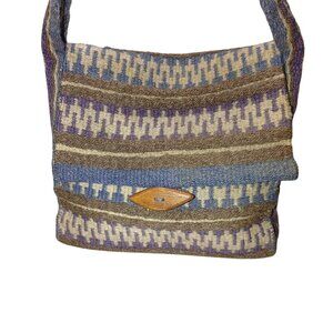 This vintage handwoven wool shoulder bag features an artisanal striped pattern in earthy tones of blue, white, and brown. Its wooden button closure adds a touch of rustic charm, making it a timeless accessory for daily use or as a collectible piece.