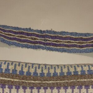 Handwoven Wool Shoulder Bag Blue White Brown Stripes Wood Button Closure Vintage