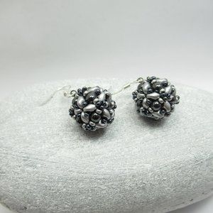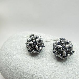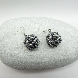 This listing is for the hand stitched beaded bead earrings pictured. These were crafted by me using silver colored Glass Superduo Czech two hole beads, hematite beads and hematite colored seed beads. These are made with my own pattern. They hang from silver plated nickel free earwires. They are in good unworn condition.