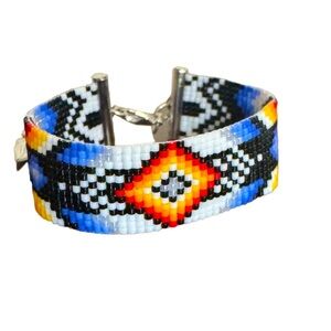 Handwoven loom cuff panel bracelet adjustable seed bead Native American motif