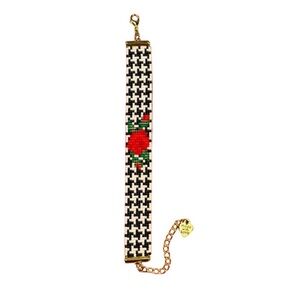 This beautiful hand woven bracelet was crafted on a loom with high-quality glass beads and depicts a beautiful rose on a stark herringbone pattern. The contrast is stunning. This is an adjustable bracelet fitting anywhere from 6.75 to 8.75 inches. It is finished with a small charm. Width is approximately .75 inches. This beautiful piece is soft, flexible, and super shiny. It’s comfortable to wear, adjustable on the wrist, and makes a statement that is not over-the-top, but is ever so pretty.