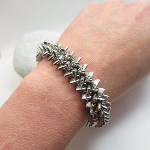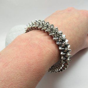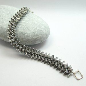 This listing is for the handwoven two hole silver triangle, two hole Superduo and seed bead bracelet pictured. This bracelet was handwoven by me using seed beads and two hole beads. The triangle shaped beads give it a 3d spiked shape. It is silver in color and finished with a 925 Sterling toggle clasp. The clasp is very secure and requires the entire t bar to be pulled through the loop for it to close, this bracelet has a tight but secure clasp, please be aware before purchase. This bracelet is 7 inches.