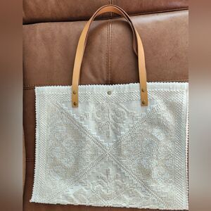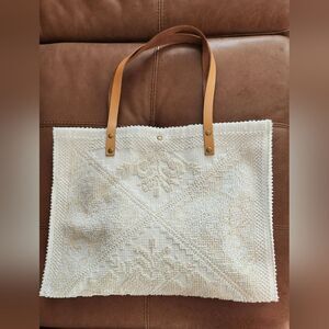 This elegant tote bag features a beautiful white design with tan leather straps, perfect for any occasion. Its stylish and versatile look makes it a must-have accessory.