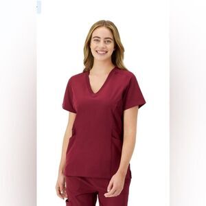 This far-from-basic scrub top features utility loops above two deep hand pockets, built-in badge holder at the neck, modern V-neckline, side-slit hems, and a tag-free interior.