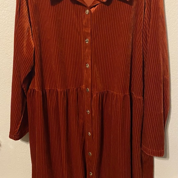 Elegant rust dress with button-up design. Features long sleeves and a classic collar.
