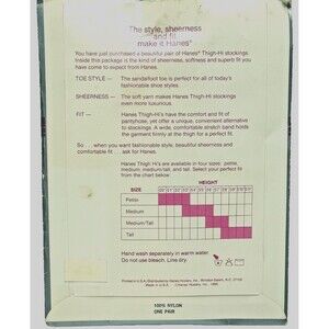 Step back into classic elegance with these vintage 1980s Hanes thigh-high stockings, style 606, made in the USA. These 100% nylon stockings feature a sandalfoot design perfect for open-toe shoes and a comfort stretch top that stays in place without binding. Color is Barely Black, size Tall, offering a semi-sheer, sophisticated look ideal for evening wear, retro fashion, pin-up styling, or collectors of vintage lingerie. Still in original packaging, these stockings deliver the timeless quality and fit of vintage Hanes. Perfect for wear or display in a vintage hosiery collection.