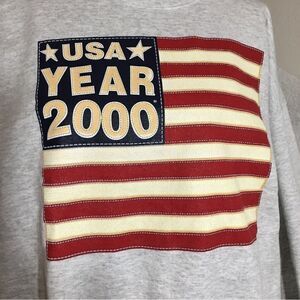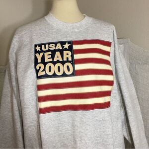 Light Grey pull over sweatshirt sweater. Has cute Y2K vintage inspired Year 2000 American Flag Graphic design. Pre-owned in great condition. Please refer to pictures for best description and condition