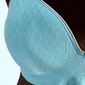Women's padded wire free t-shirt bra from Hanes in turquoise green with a pattern that looks like mermaid scales. SIZE MEDIUM. Due to light & screen variations, colors may vary slightly from the images