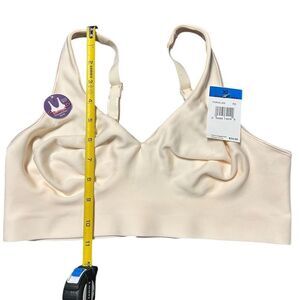 The Hanes T-Shirt Bra in size XL offers a comfortable fit with its wire-free and seamless design. Made from a blend of polyester and spandex, this Cream bra is smooth and ideal for everyday wear. It is machine washable for easy care. The product is new with tags.