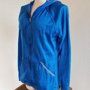 This auction is for a women's size medium blue fleece polyester lightweight jacket, with a full front zipper and hood. It's in excellent pre-owned condition, no stains, holes, pilling or other damage.