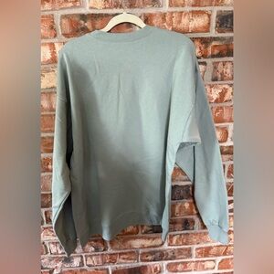 This Hanes sweatshirt features a relaxed fit with long sleeves, perfect for a casual day out. The soft green color is complemented by a playful pink smiley face design on the front, adding a touch of fun to your wardrobe. Crafted for comfort, it includes traditional ribbed cuffs and neckline for a classic look. Size large. Smoke free home. Never worn.