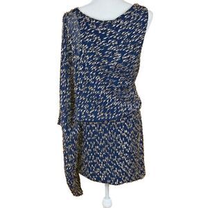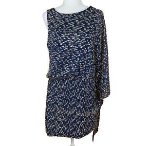 Haney Lucia Dress Size 8 Navy Blue Silk Blend 1-Shoulder Asymmetric Embellished. Navy blue viscose, silk, polyester blend chiffon shell, embellished throughout with gold metallic fils coupé embellishment throughout. Fully lined in silk. Sleeveless on right side; dramatic draped kimono/cape style sleeve on left side. Hidden left side-seam zipper with hook and eye closure. Slightly blouson bodice. Asymmetric hemline.