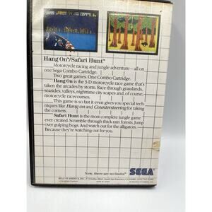 The Hang On & Safari Hunt: The Combo Cartridge for the Sega Master, released in 1986 by SEGA, offers a compilation of two classic arcade games in one cartridge. Players can enjoy the exciting "Hang On" game where they control a stunt motorcyclist navigating through various terrains, and the thrilling "Safari Hunt" where they take on the role of a hunter tracking down various animals in the safari. This combo cartridge provides a nostalgic gaming experience for fans of classic Sega Master games.