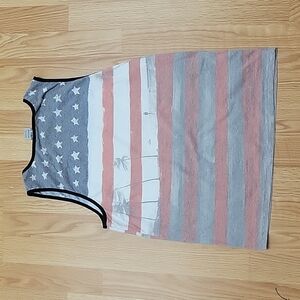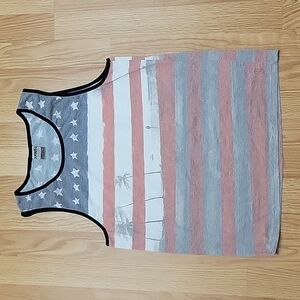 Additional Details: Allover American flag print with subtle palm trees, Contrasting scoop neckline and armholes, Sleeveless silhouette.